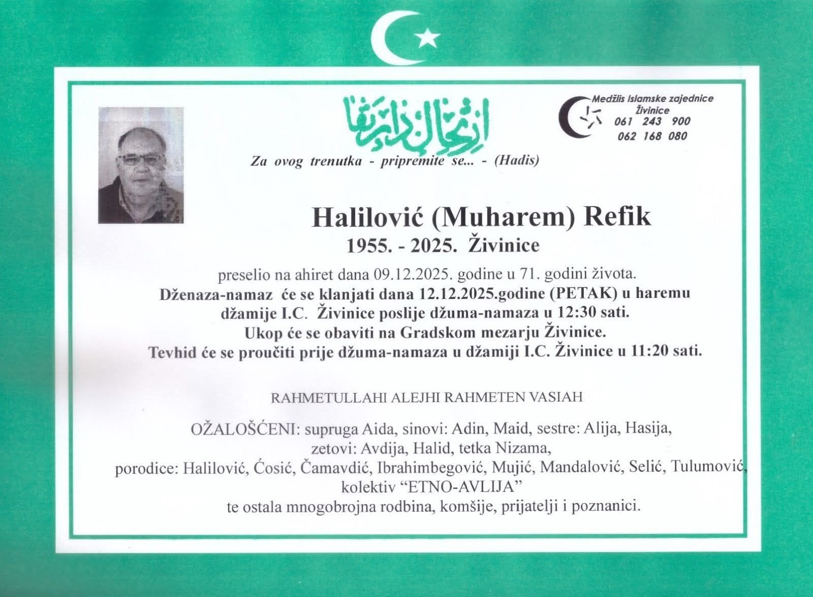 Dženaza namaz Refiku Haliloviću bit će klanjana 12.12.2025. godine (petak) u haremu džamije IC Živinice poslije džuma namaza u 12:30 h.