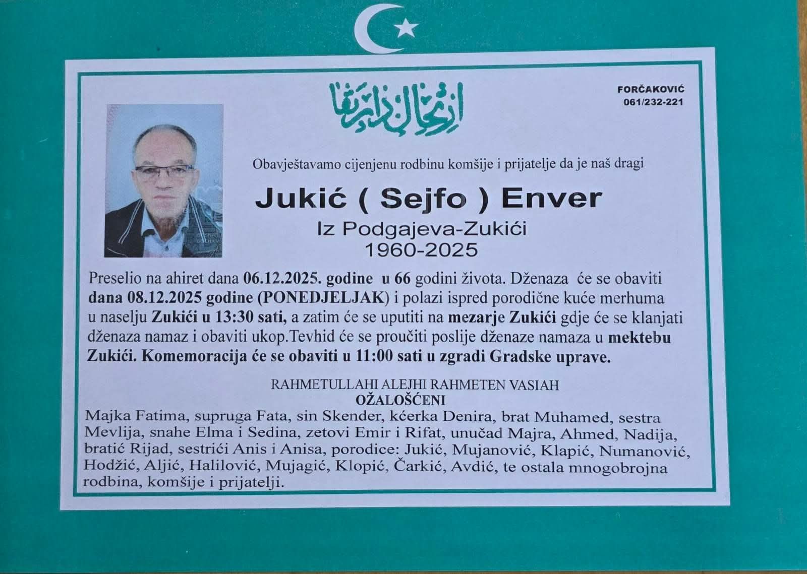 Nakon komemoracije, dženaza rahmetli Enveru Jukiću će se obaviti u Podgajevima, naselje Zukići u 13:30 sati.